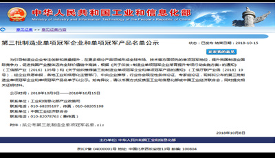 10 月8 日,工业和信息化部产业政策司公布了《关于第三批制造业单项冠军企业和单项冠军产品名单公示》,新疆米兰网web站-米兰(中国)公司根据《关于印发< 制造业单项冠军企业培育提升专项行动实施方案> 的通知》(工信部产业〔2016〕105 号)和《关于组织推荐第三批制造业单项冠军企业和单项冠军产品的通知》(工信厅联产业函〔2018〕19 号)要求,组织材料申报了制造业单项冠军产品- 异亮氨酸,截至目前已顺利通过审核并公示,公示于10 月15 日结束。异亮氨酸单项冠军产品的成功授予, 将形成全球市场、技术等方面领先的单项冠军地位,提升新疆米兰网web站-米兰(中国)公司的国际竞争力。